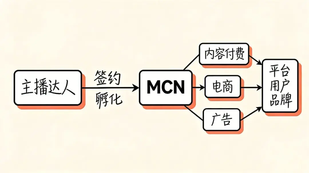 在这一过程中,MCN就像是一个转化器,先通过签约、孵化主播达人来获取内容,然后再将其售卖给平台、用户、品牌等客户,实现电商、广告、内容付费等收益。
